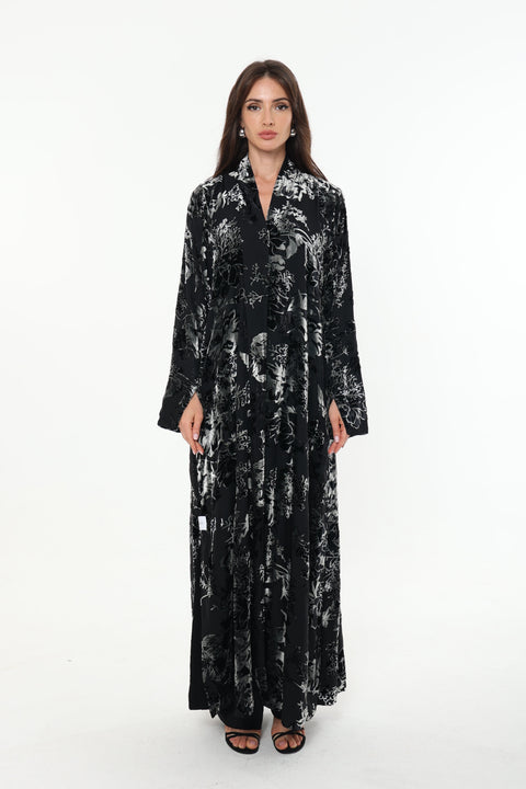 A luxurious black velvet abaya adorned with silver floral embroidery. The rich velvet fabric combined with shimmering silver details creates an elegant and sophisticated look, perfect for special occasions and glamorous evening events.